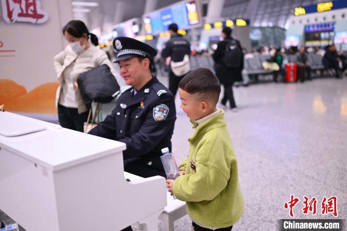 蔡显杰在杭州东站为回家旅客弹琴。 杭州铁路公安处 供图