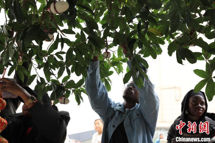 外国友人将“仙桃”挂上树梢。陈敏瑶 摄