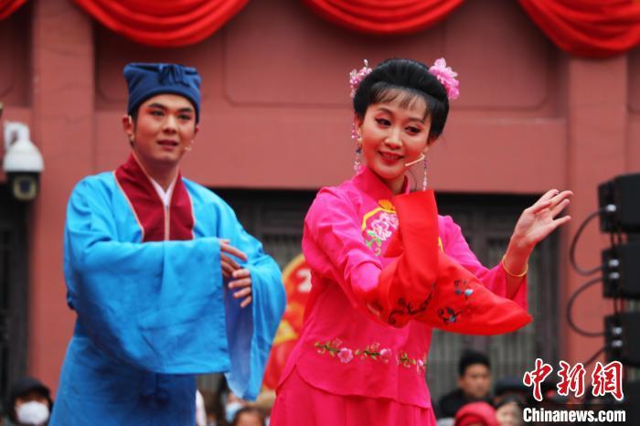 2月12日,农历正月十五,“金蛇迎春闹元宵”专场文艺演出在合肥市庐州府城隍庙大院内举行,吸引数千名合肥市民和游客前来观看。图为黄梅戏演员在表演黄梅戏经典剧目《夫妻观灯》。朱孔阳 摄