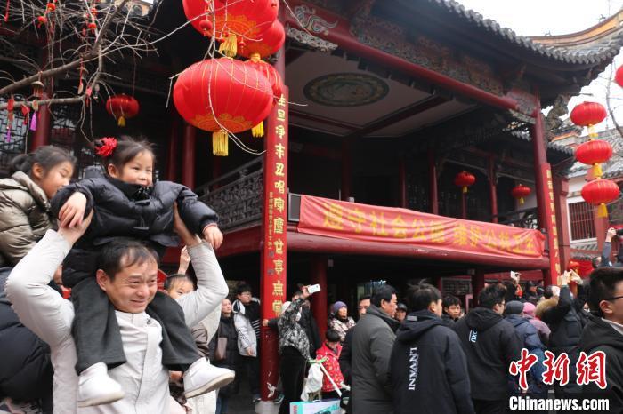 2月12日,农历正月十五,“金蛇迎春闹元宵”专场文艺演出在合肥市庐州府城隍庙大院内举行,吸引数千名合肥市民和游客前来观看。图为合肥市民现场参观文艺演出。朱孔阳 摄