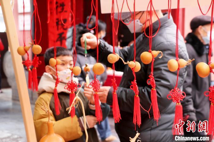 2月12日,农历正月十五,“金蛇迎春闹元宵”专场文艺演出在合肥市庐州府城隍庙大院内举行,吸引数千名合肥市民和游客前来观看。图为游客在欣赏把玩葫芦烙画。朱孔阳 摄