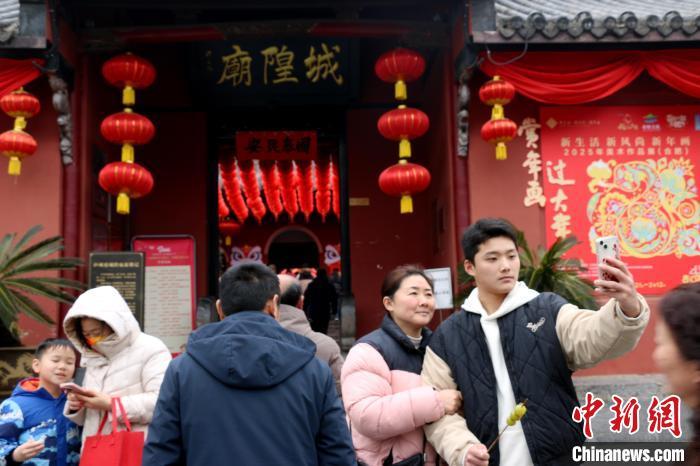 2月12日,农历正月十五,“金蛇迎春闹元宵”专场文艺演出在合肥市庐州府城隍庙大院内举行,吸引数千名合肥市民和游客前来观看。图为游客在现场拍照留念。朱孔阳 摄