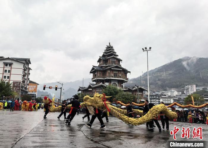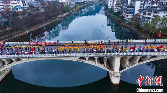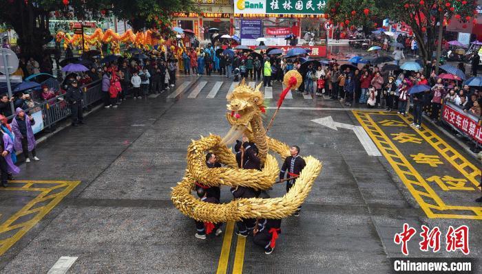 2月12日是农历正月十五,在广西桂林市龙胜各族自治县,来自该县各个乡镇的龙狮队伍开展巡游和展演,为中外游客献上一场独具魅力的民俗文化盛宴。据统计,春节期间,龙胜共开展各类文化活动90余场。图为来自乐江镇的吊龙正在进行展演。韦吉阳 摄