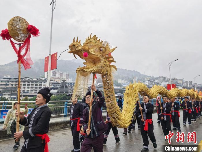 2月12日是农历正月十五,在广西桂林市龙胜各族自治县,来自该县各个乡镇的龙狮队伍开展巡游和展演,为中外游客献上一场独具魅力的民俗文化盛宴。据统计,春节期间,龙胜共开展各类文化活动90余场。图为来自平等镇的草龙队正在进行展演。韦吉阳 摄
