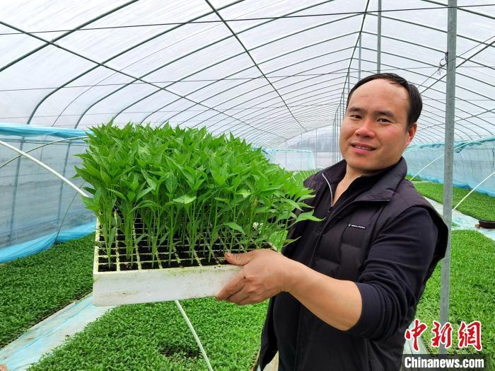 龙建富展示自己培育的辣椒苗。 胡卫红 摄