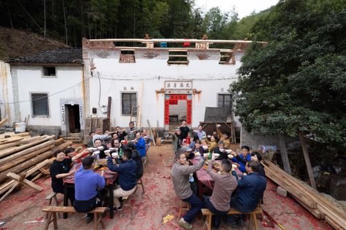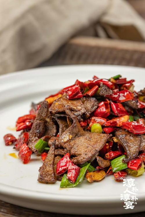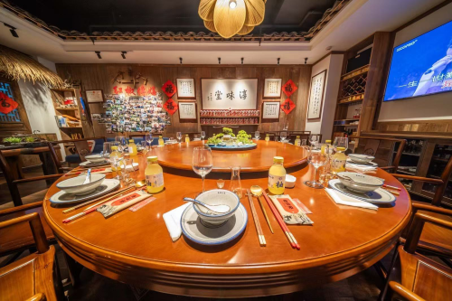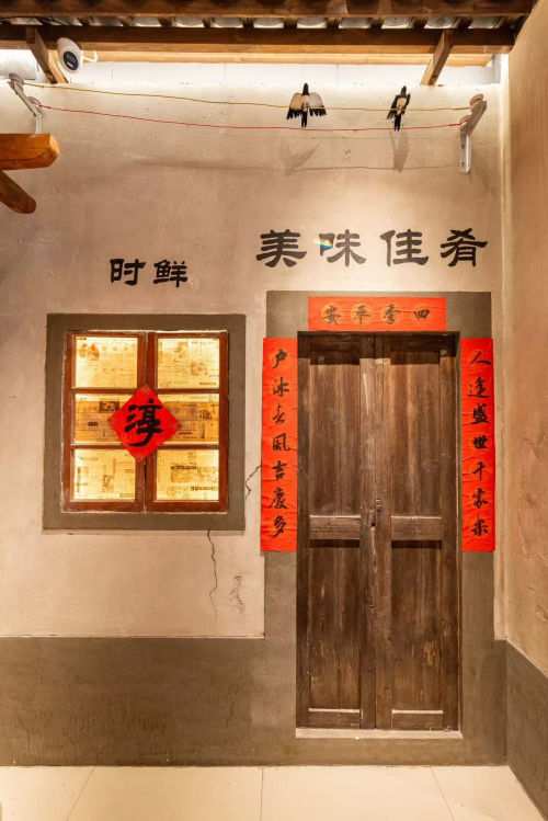 我还蛮喜欢宋总介绍:“这是阿嬷陪嫁的物件,从前村里谁家娶媳妇都要借去撑场面”的故事,特别是那幅老宅照片,大家坐在宋总屋门前吃饭喝酒,地面上的烟花爆竹碎片红红撒满一地,边上堆着许多杉木料,还有宋总敬大家酒的喜气和笑容与几十张形态各异的村民脸庞甚是和諧合拍;最喜欢一个包厢名是“外外家”,一开始没有搞明白,后来音译了就是淳安人叫外婆的意思“外外,就是外婆”。对了前厅摆着的粗陶罐里腌着野山椒,木格窗棂上垂下的红辣椒串,还有十几个暖锅与热气腾腾的汤瓶,倒像是把整个千岛湖的烟火气都搬进了城里。我经常看见客人举着手机拍“老淳安”祖传的竹编食盒等,说这些摆件比网红店的东西更有味道。