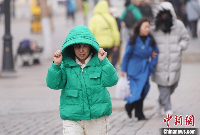 3月10日,哈尔滨市出现浮尘天气,图为行人在路上迎风匆匆而行。 赵宇航 摄