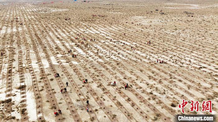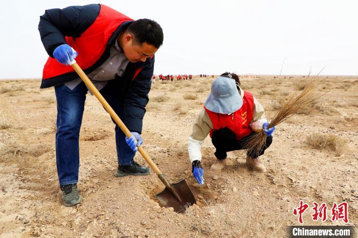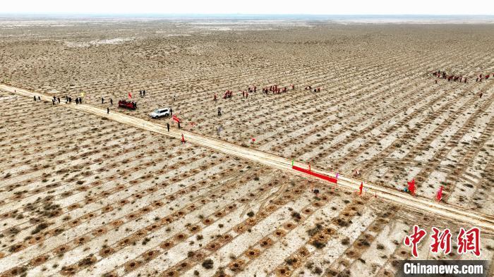 植树节来临之际,甘肃省武威市民勤县昌宁西沙窝四方墩青梭公益生态林基地内人头攒动,来自当地的5000余名干部职工在广袤的盐碱滩地上,种植梭梭苗,在挥锹铲土、扶苗培土等工序后,梭梭苗在盐碱滩上整齐排列,成为防风固沙的新生力量。据了解,当地在巴丹吉林沙漠侵袭民勤的最前沿建立锁边林带,主要以种植梭梭、红柳、花棒等一些沙生植物为主,在一些移动沙丘上做草方格沙障,计划2025年的春天栽植5000—6000亩,现在已完成了3000亩的栽植任务。王珍艳 摄
