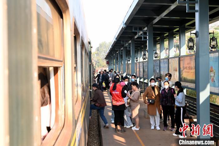 图为游客乘坐开远市南北轨道交通列车体验滇越铁路“旧时光”。李嘉娴 摄