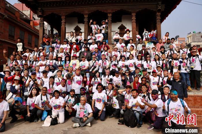 3月13日,参加“镜头下的尼泊尔”活动的中国摄影师与尼泊尔友人在加德满都杜巴广场合影。 苏尼尔·夏尔马 摄