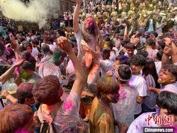 3月13日,多国游客与尼泊尔民众在加德满都杜巴广场狂欢,庆祝洒红节。中新社记者 崔楠 摄