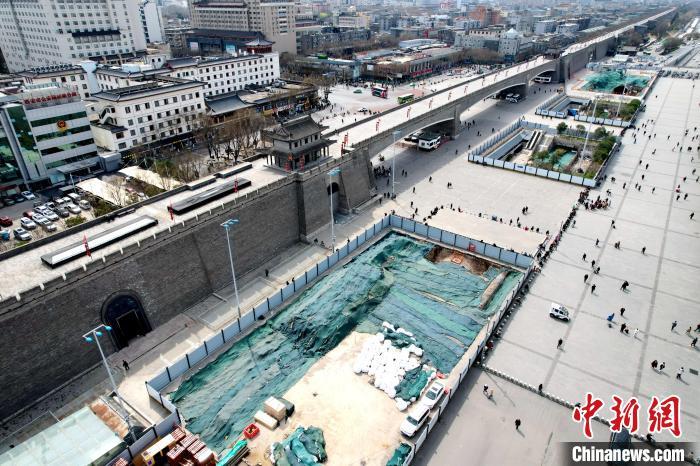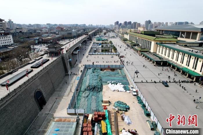 3月18日,航拍西安市护城河及环城公园改造(二期)火车站段现场。改造完成后下层是排污排水,上层是4处护城河景观水面,工程预计今年年底完成。(无人机照片)中新社记者 张远 摄
