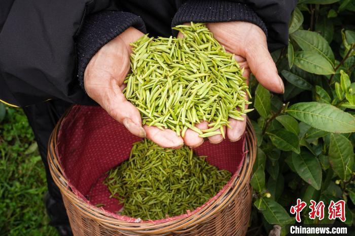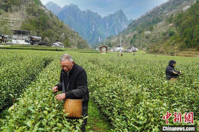 随着气温回暖,湖北省恩施土家族苗族自治州鹤峰县、宜昌市五峰土家族自治县等地茶园陆续进入采收期,茶农们抢抓农时,采摘加工2025年首批春茶,抢“鲜”供应市场。鹤峰、五峰地处鄂西南武陵山区,共有茶园60余万亩,是万里茶道的重要茶源地之一。图为鹤峰县中营镇元井村茶叶种植基地茶树绵延成片。徐可 摄