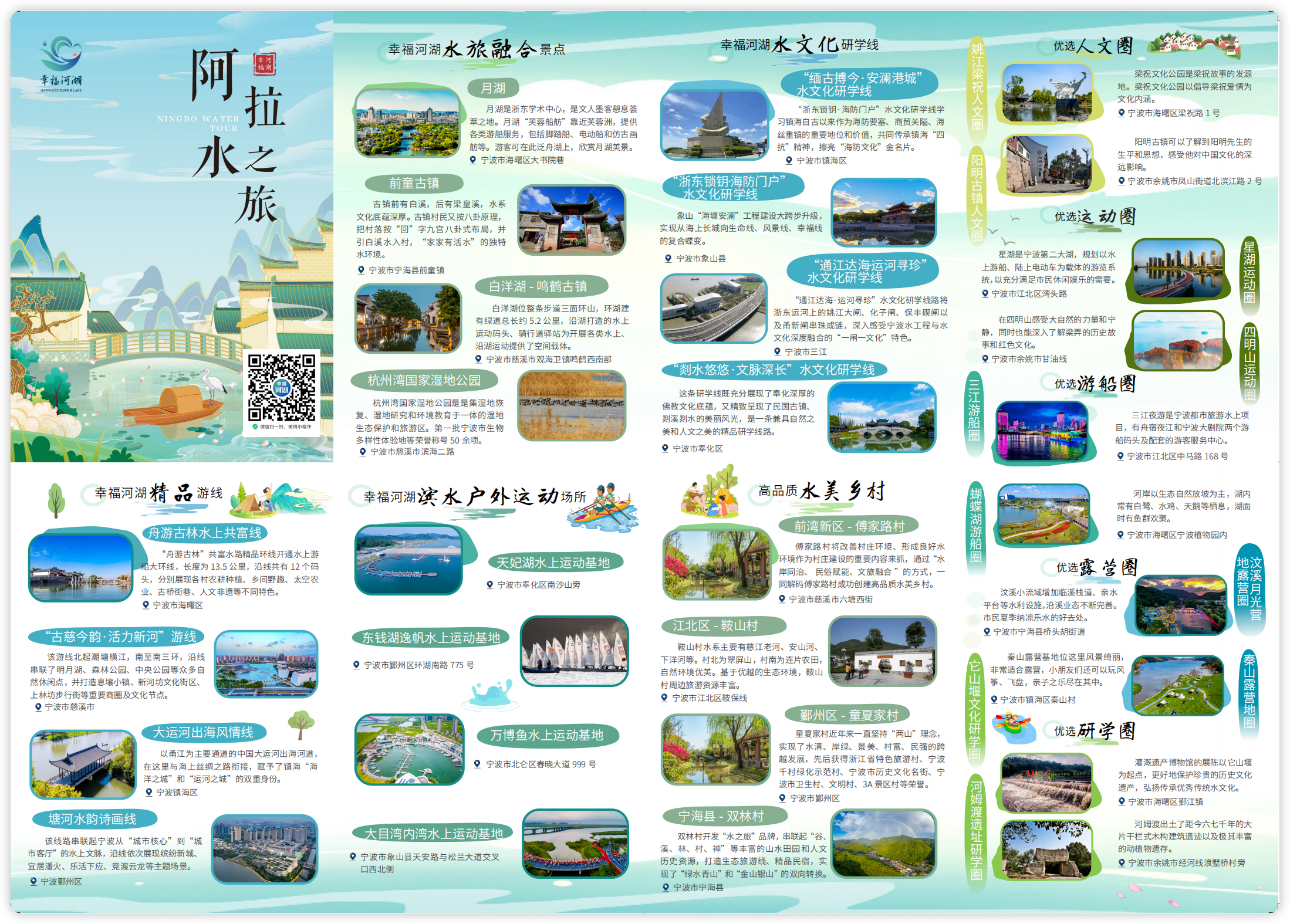 无论鄞州的 “都市滨水”、海曙的“舟游古林”,还是奉化的“山海溯源”,您只需打开“宁波水利”公众号,点击右下角“幸福河湖手绘地图”,或搜索“幸福河湖手绘地图”小程序,就能一键获取线路、语音讲解、实时导航,开启属于自己的亲水之旅。