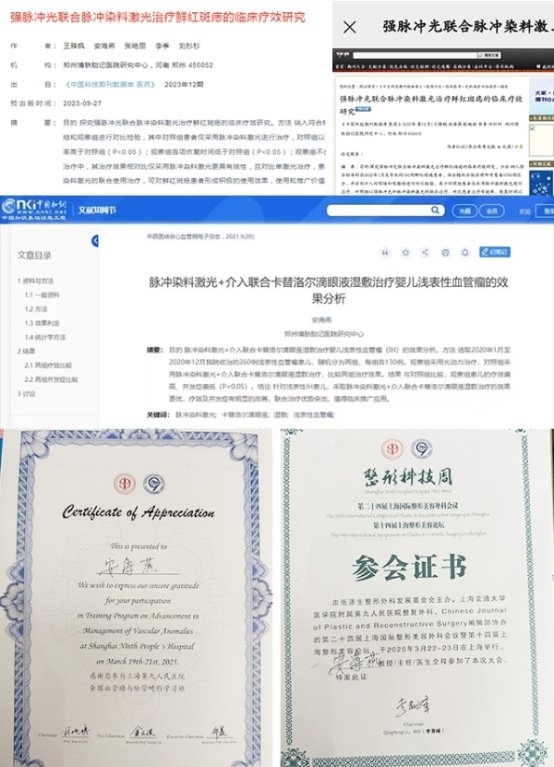 当下血管型胎记前沿治疗手段百花齐放,各有千秋。以光动力疗法为例,它通过光敏剂在特定光照下对病变血管发起精准“攻击”,对大面积、增厚型鲜红斑痣疗效出众,且治疗后留疤风险低,是很多血管型胎记患者比较青睐的治疗方式之一。安海燕主任发表的《脉冲染料激光+介入联合卡替洛尔滴眼液湿敷治疗婴儿浅表性血管瘤的效果分析》中也曾指出光动力在婴幼儿浅表性血管瘤治疗上的优势,《强脉冲光联合脉冲染料激光治疗鲜红斑痣的临床疗效研究》中也提到过强脉冲光联合光敏剂进行光动力治疗的有效性与安全性。