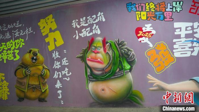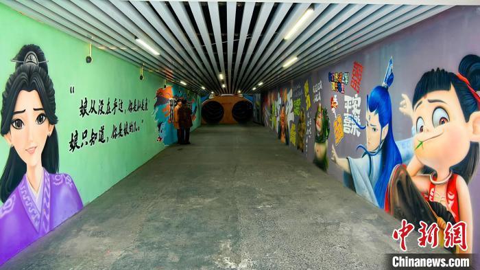 春分时节,山西晋城高平市北城街街道西关社区的民心隧道,《哪吒2》中的动画人物“破壁而出”,配着经典台词,出现在隧道墙壁上。 王耀彬 摄