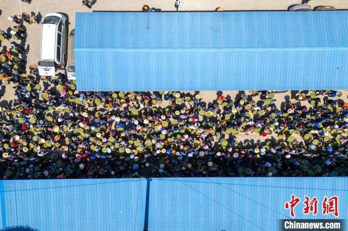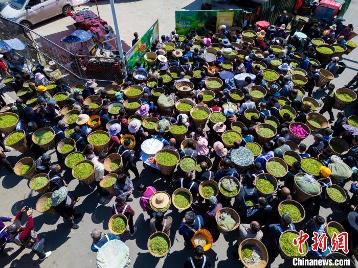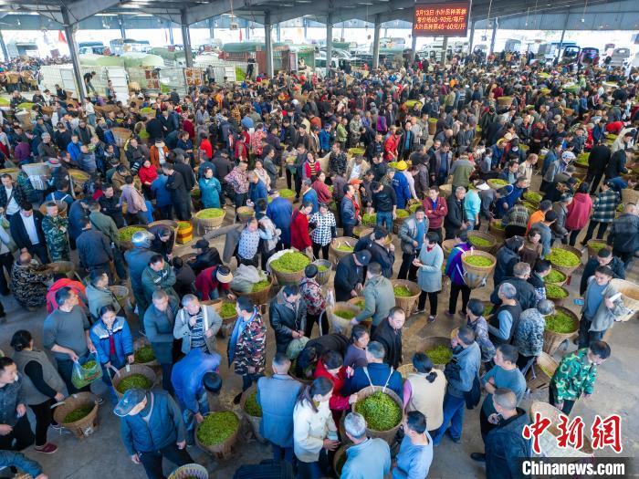 图为繁忙的红星镇鲜叶交易市场。(无人机照片)中新社记者 张浪 摄