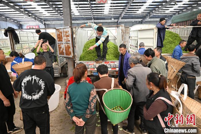 图为茶商在双河鲜叶交易市场采购的鲜叶装满车。 中新社记者 张浪 摄