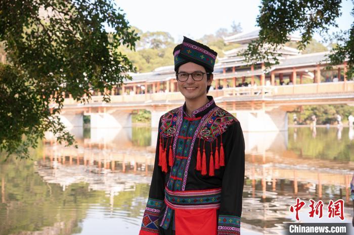 3月23日,新西兰音乐人林外穿着广西民族服饰在广西柳州市“打卡”。林恩 摄