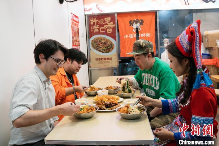 3月23日,新西兰音乐人林外(左一)品尝柳州螺蛳粉。林恩 摄