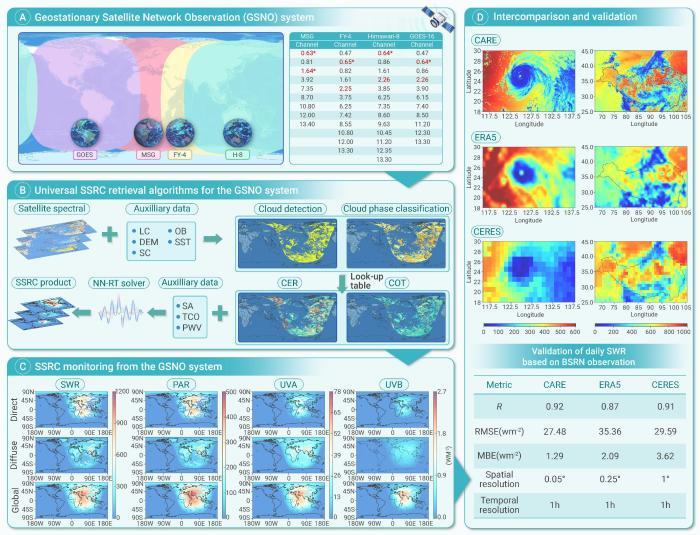 在2023年研发的地表太阳辐射近实时遥感监测系统基础上,研究团队突破多星协同过程中光谱差异和观测几何差异等带来的遥感难题,实现中国风云四号卫星、日本葵花八号卫星、欧洲第二代气象卫星和美国地球静止环境业务卫星等国际上最新一代地球静止卫星的一体化融合应用。