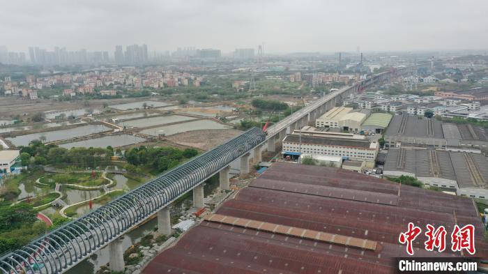 中新社佛山3月31日电 (郭军 李光辉)3月31日8时,随着最后一方混凝土入模,广湛高铁最大跨度全封闭式声屏障连续梁顺利合龙,标志着广东省首个时速350公里高铁“隔音隧道”建设取得突破性进展。