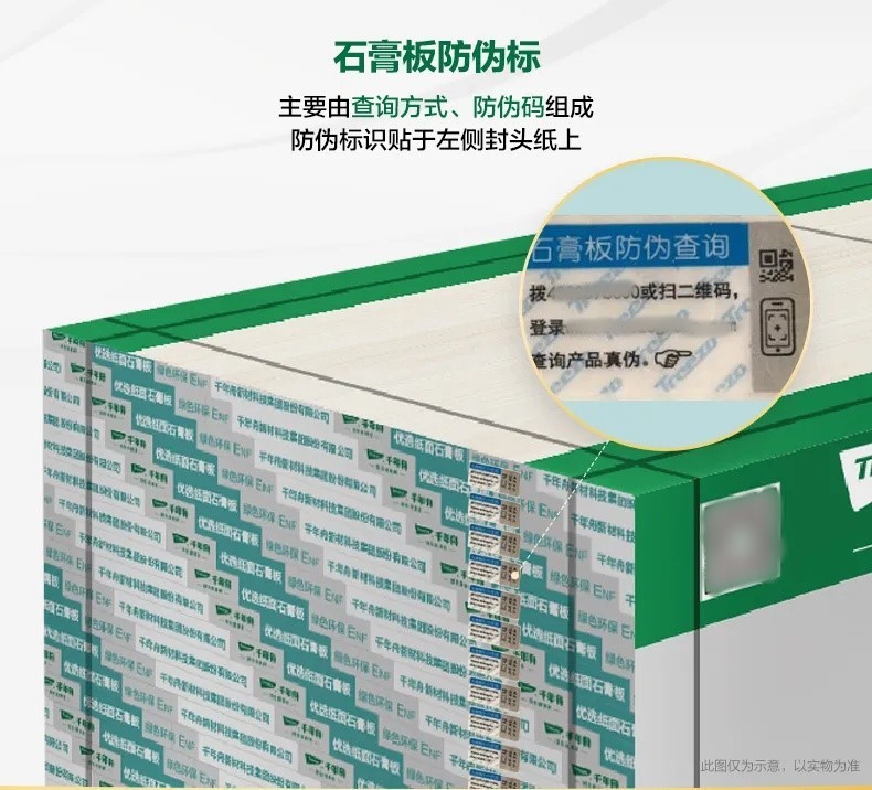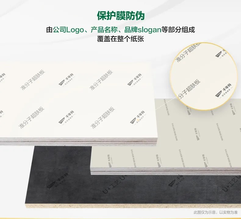 由公司Logo、工厂代码、功能标识、板材等隐型防伪标识组成,激光笔扫描会显现“千年舟Logo”图样。