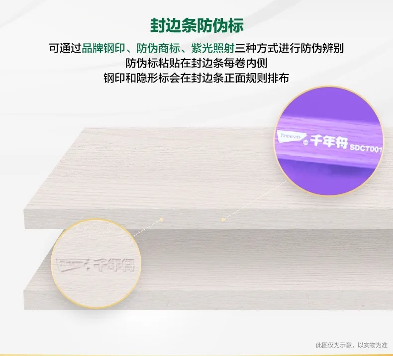 可通过品牌钢印、防伪商标、紫光照射三种方式进行防伪辨别,防伪标粘贴在封边条每卷内侧,钢印和隐形标会在封边条正面规则排布。