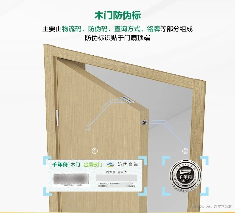 主要由物流码、防伪码、查询方式、铭牌等部分组成,防伪标识贴于门扇顶端。