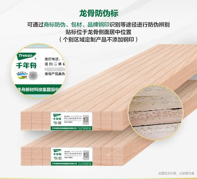 可通过商标防伪、包材、品牌钢印识别等途径进行防伪辨别,贴标位于龙骨侧面居中位置(个别区域定制产品不添加钢印)。