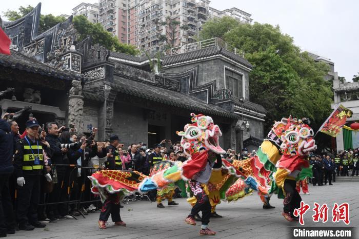 中新网广州3月31日电 (孙秋霞 骆荟茵)“三月三·荔枝湾”民俗文化活动31日在广州荔湾举行,启动仪式上,10多位汉服佳人从文塔祈福归来,为现场嘉宾以兰草净水洗去尘埃,呈现古时祓禊场景,泮塘村长老们上台进行醒狮点睛及切烧猪,祈愿风调雨顺、福泽绵长。