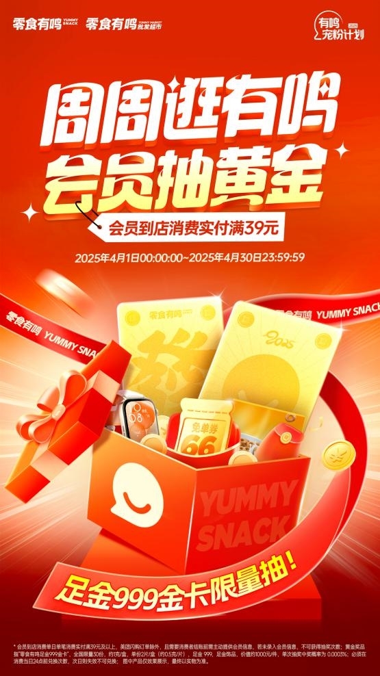 作为“打头阵”的首个宠粉活动,4月1日-4月30日,零食有鸣公司旗下零食有鸣批发超市和零食有鸣零食集合店开启了第一波“周周逛有鸣,会员抽黄金”为主题的购物抽黄金活动,会员到店实付满39元,就可以参与抽黄金活动,每天实付满39元都可抽奖一次,最高可抽中1克的零食有鸣足金999金卡,总共有多达30份奖品将被幸运会员抽中,此外,幸运会员还可抽到华为智能手表、66元免单券等惊喜好礼。
