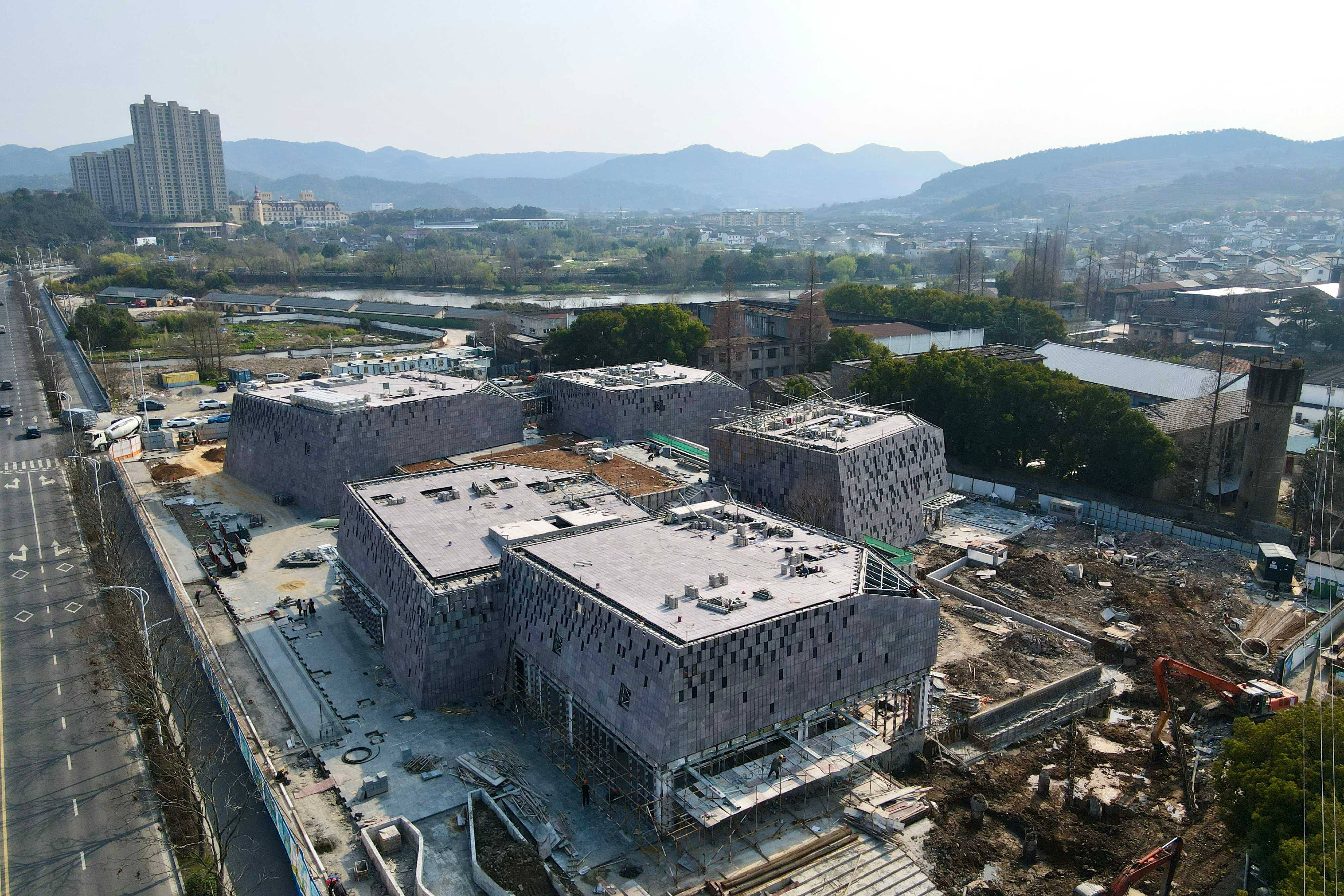 据裘燕萍介绍,设计方为博物馆选取的设计理念是“水中的石头”。“一共五块‘石头’,对应四组主体建筑,可以理解成每座建筑都是一块石头。最后‘水流’用会通过不同形式贯穿在主入口、屋顶、周边,营造出‘水石相生’的感觉。就像它山堰本身,也是‘水中的石头’。”