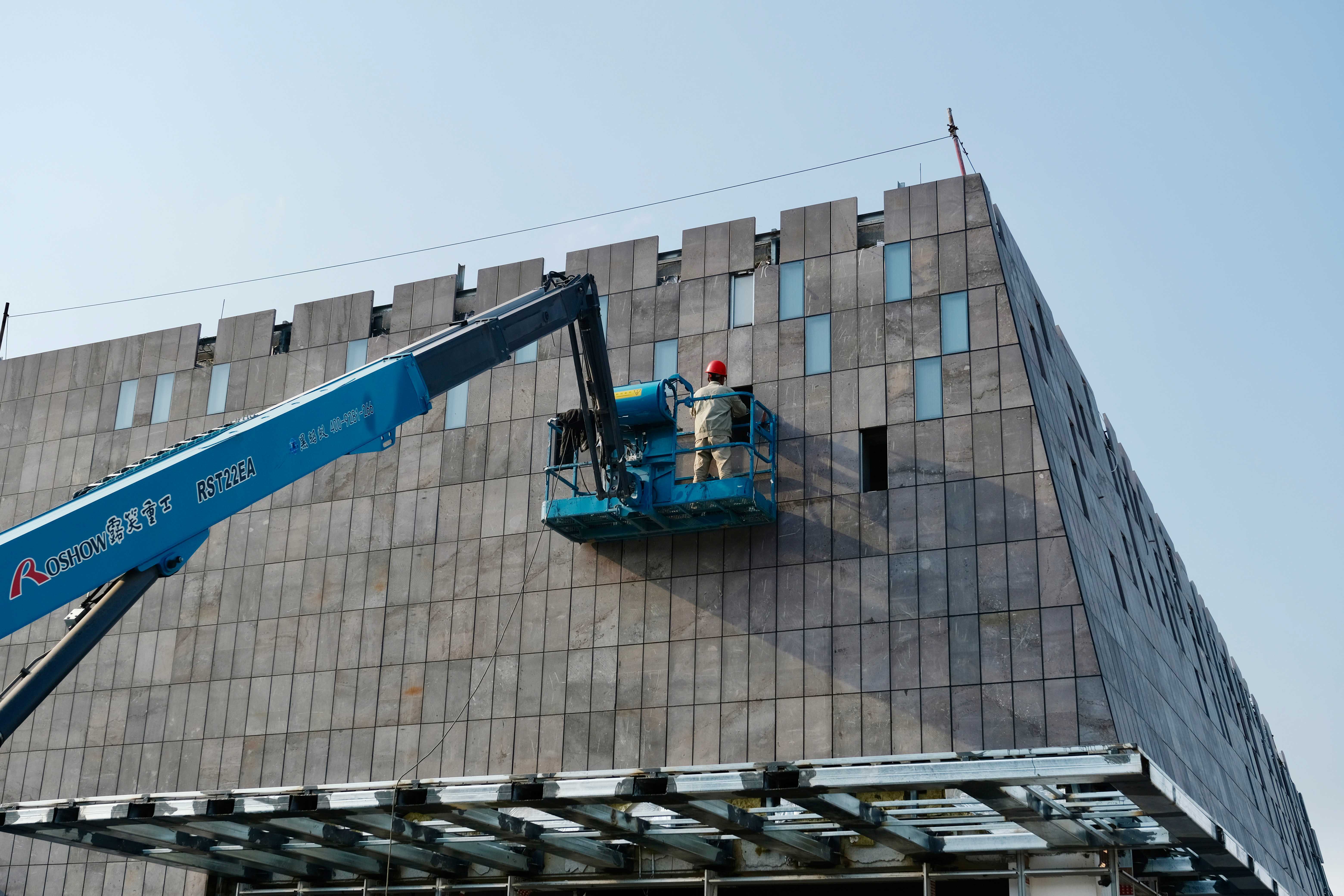 梅园石“拼贴”的外立面与玻璃“雨滴”。