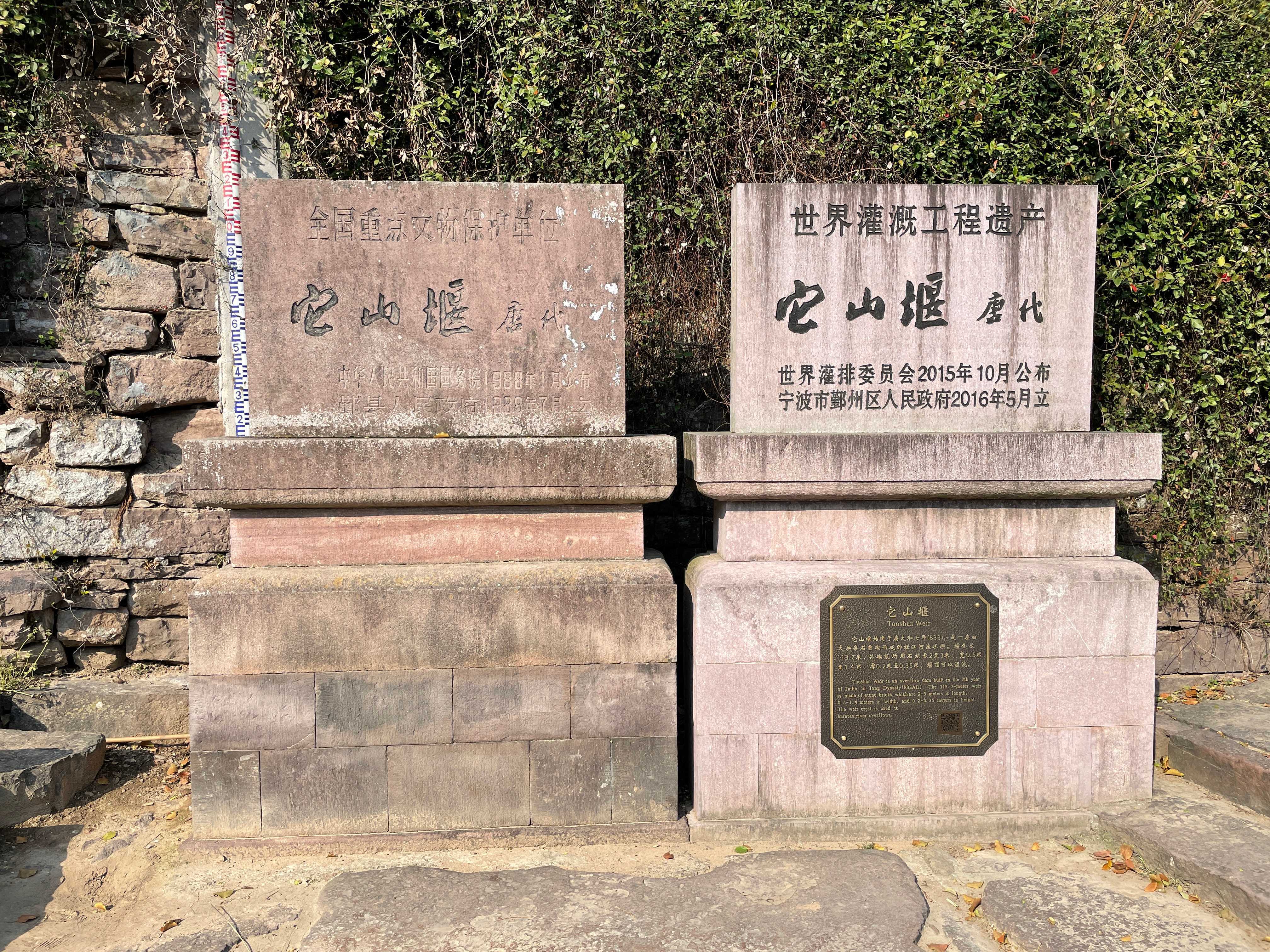 鄞江桥前,两山夹峙,古堰横江,波平水静。它山堰一带的风光,千百年来并没有太大的变化。与“其貌不扬”的堰堤本身形成反差的是,堰北有两块碑,一块写着“全国重点文物保护单位”,一块写着“世界灌溉工程遗产”。