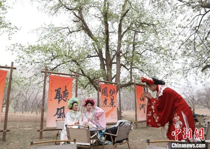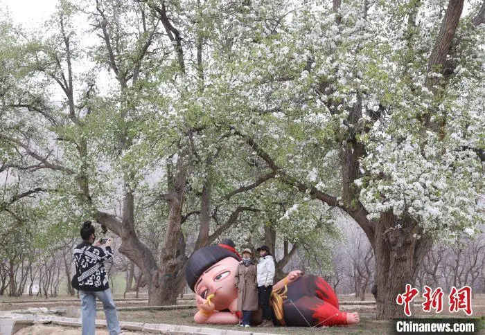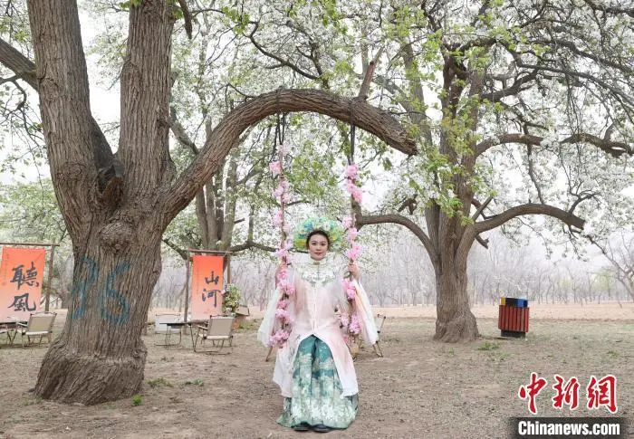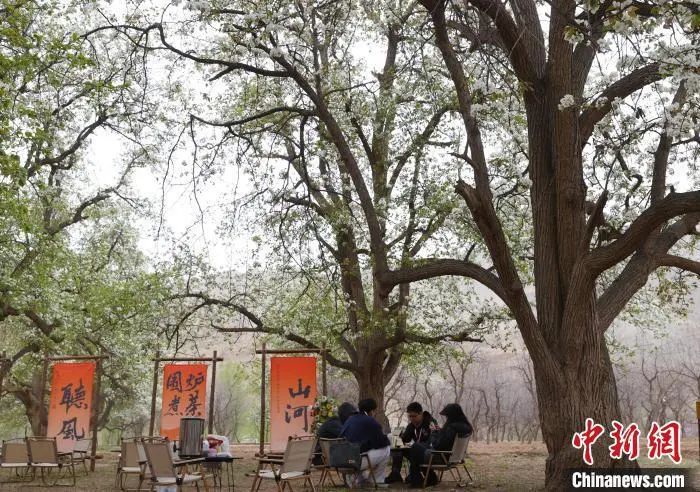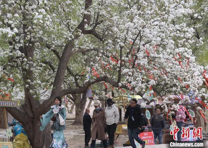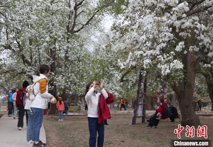 4月11日,宁夏中卫市第十九届南北长滩黄河梨花季暨西北民歌(花儿)歌会在沙坡头区迎水桥镇南长滩村举行,来自全国各地的游客齐聚“宁夏黄河第一村”,共赏梨花盛景。图为游客在梨园打卡拍照。中新社记者 于晶 摄