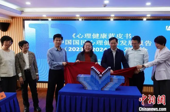 《心理健康蓝皮书:中国国民心理健康发展报告(2023~2024)》在北京发布,图为新书揭幕仪式。中新网记者 孙自法 摄