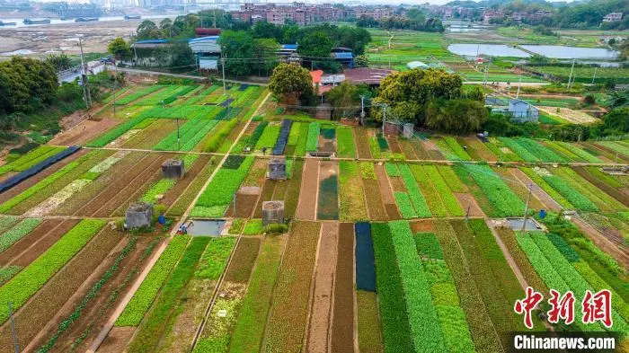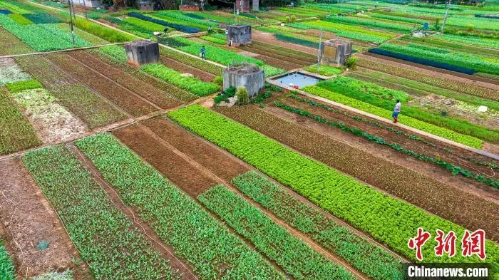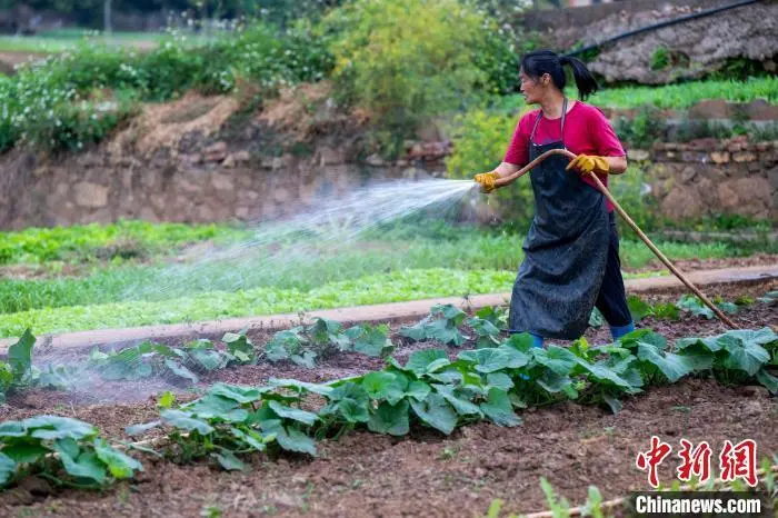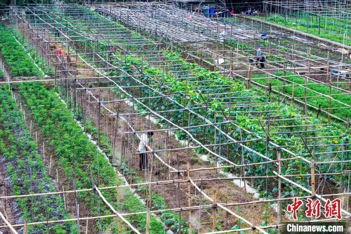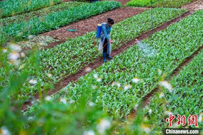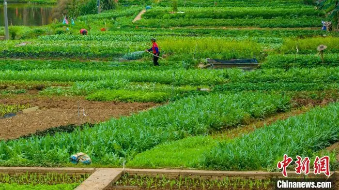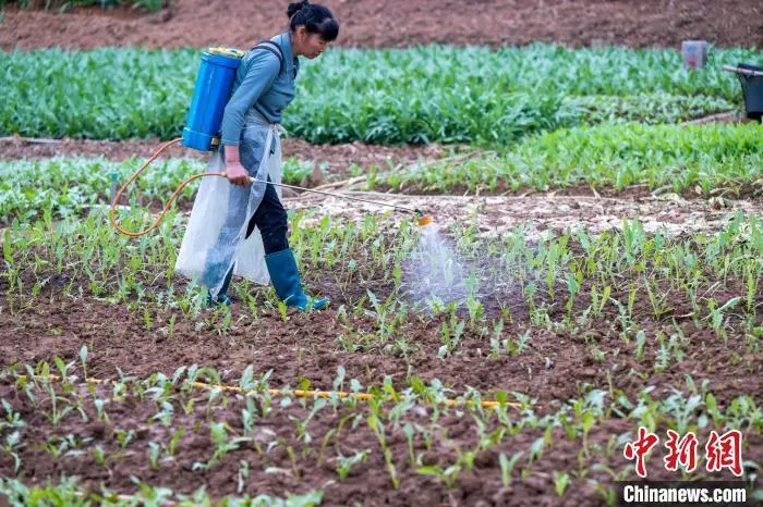 4月18日,广西梧州市长洲区蔬菜种植基地,农民抢抓农时,有序开展耕地、培育种苗、种植、喷淋、覆膜等春耕春管农事活动,田间地头一片繁忙景象。图为菜农在管护蔬菜。何华文 摄