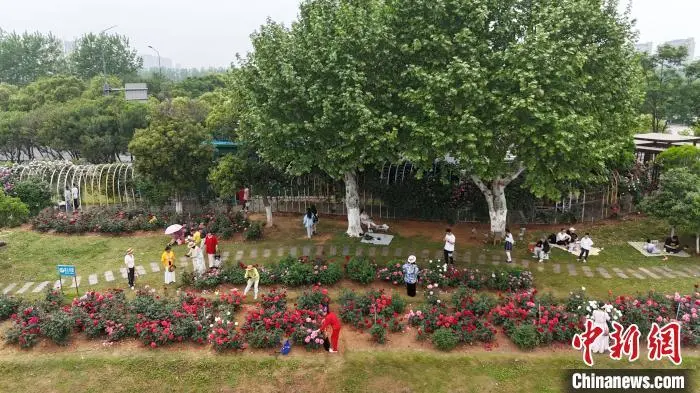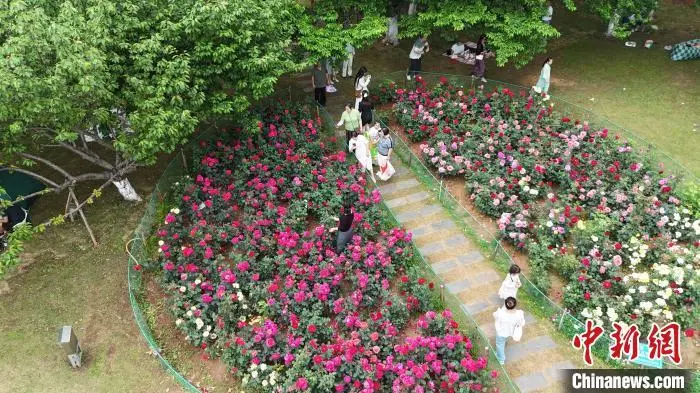 在月季园内打卡拍照的市民游客。(无人机照片) 熊锦阳 摄