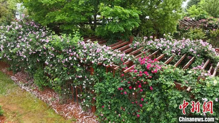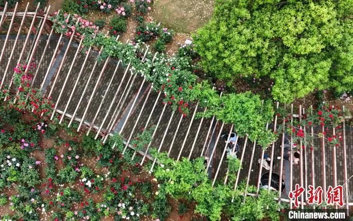 4月20日,走进江西南昌红谷滩区滨江月季园,十三万株月季花迎来盛花期,吸引了众多市民游客打卡游玩。滨江月季园栽种月季总面积达5000平方米,拥有200多个品种的月季花,月季品种以大花月季为主,布置有丰花月季品种展区、微型品种展区、地被月季展区、藤本月季展区,花期将持续到11月。图为满是月季花的园内长廊。(无人机照片) 熊锦阳 摄