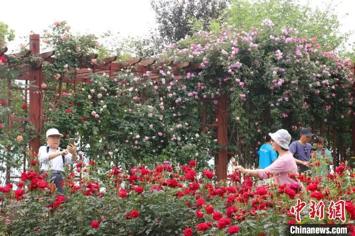 在月季园内打卡拍照的市民游客。 熊锦阳 摄