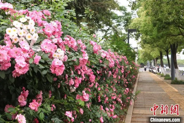 月季园外的人行道旁,满是盛开的月季花。 熊锦阳 摄