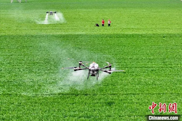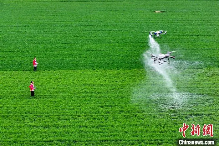 4月18日,在山东省聊城市茌平区乐平铺镇大尉庄村高标准农田里,茌平丰信农业服务有限公司技术人员操作植保无人机进行小麦“一喷三防”作业。马红坤 摄
