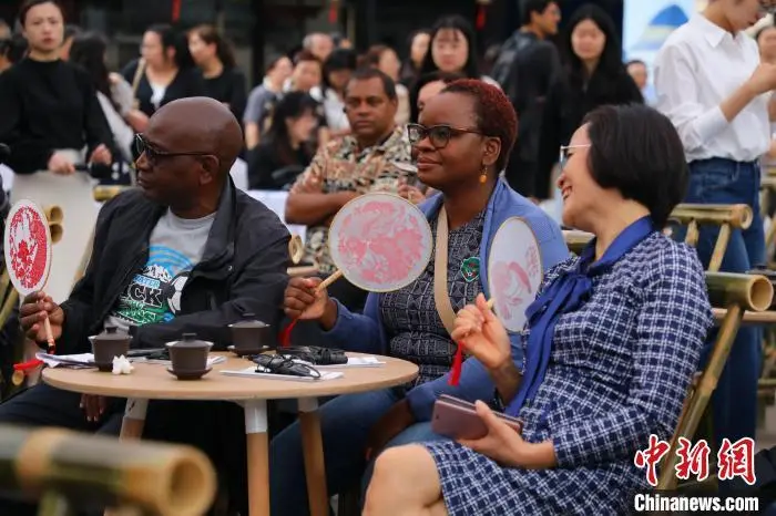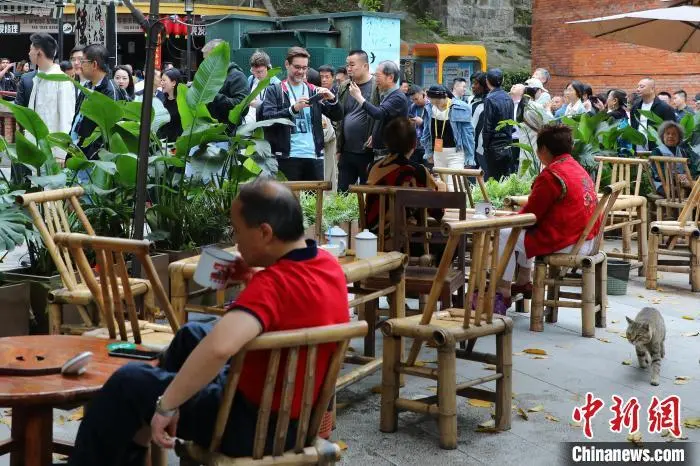 图为外国媒体记者在民主村社区喝茶聊天。梁钦卿 摄