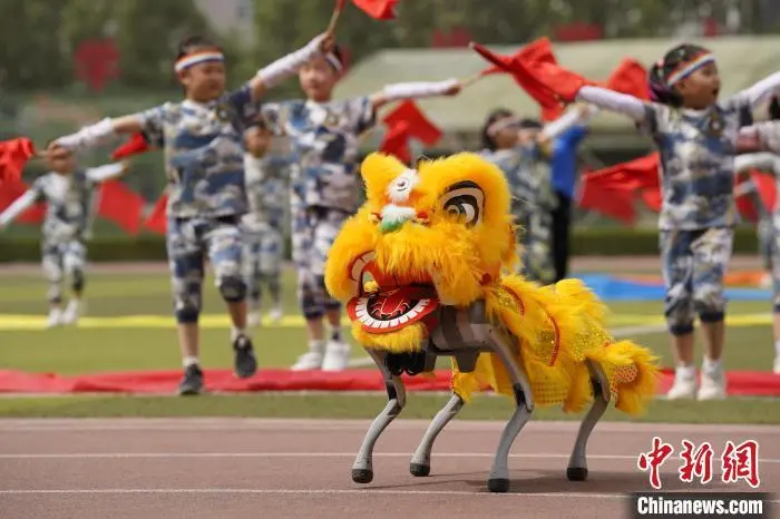 图为军事体育运动会开幕式上,身披金红“狮皮”的机器狗成为全场焦点。 陈晟 摄