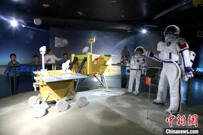 4月23日,山东临沂,临沂银河小学的学生在科技馆观看月球车。孙磊 摄