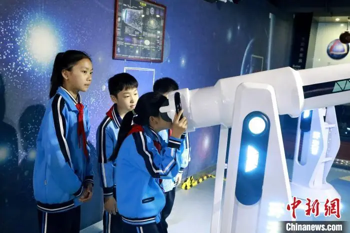 4月23日,山东临沂,临沂银河小学的学生在科技馆体验太空望远镜。孙磊 摄