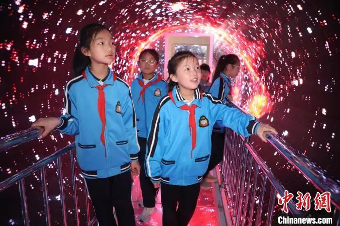 4月23日,山东临沂,临沂银河小学的学生在科技馆体验时空隧道。孙磊 摄