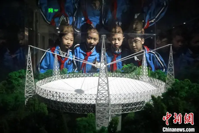 4月23日,山东临沂,临沂银河小学的学生在科技馆观看球面射电望远镜模型。当日,为了迎接第十个“中国航天日”,山东临沂多地开展航天主题活动,让孩子们深入体验航天科学的乐趣和神奇之处。孙磊 摄