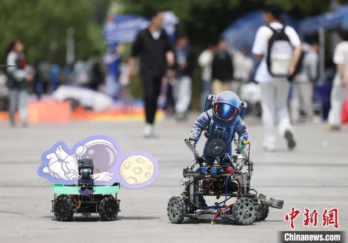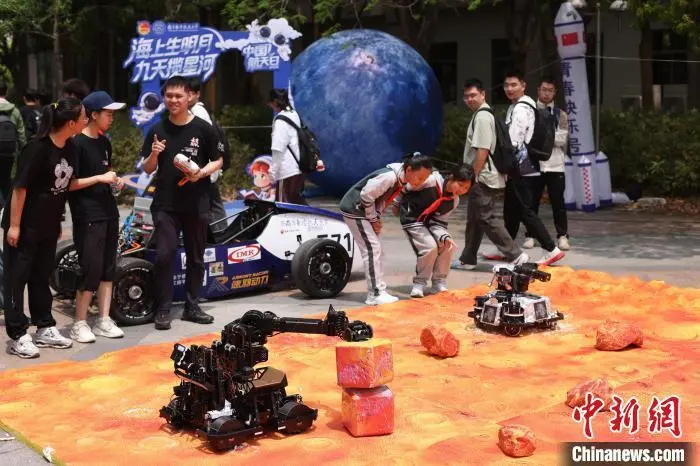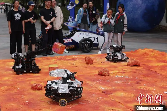 4月23日,在第十个中国航天日即将到来之际,南京航空航天大学“航天嘉年华”系列活动在该校将军路和天目湖两校区火热开展,航模竞赛中获奖飞行器展示、航天模型制作、模拟火星车演示……展示航天技术,弘扬航天精神。此次活动由该校团委和航天学院共同主办,旨在引领广大青年学子放飞“蓝色梦想”,在实践中了解中国航天发展史、近距离触摸航天科技,感受一脉相承的航天精神与星辰大海。图为学生操控模拟火星车在“火星探测区”进行演示。中新社记者 泱波 摄